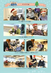 ボランティアのクスクスさんに来ていただき、クリスマス会を行いました!歌や音楽に合わせて手拍子を打ったり、口ずさんだり、皆さん思い思いに楽しんでおられました♪